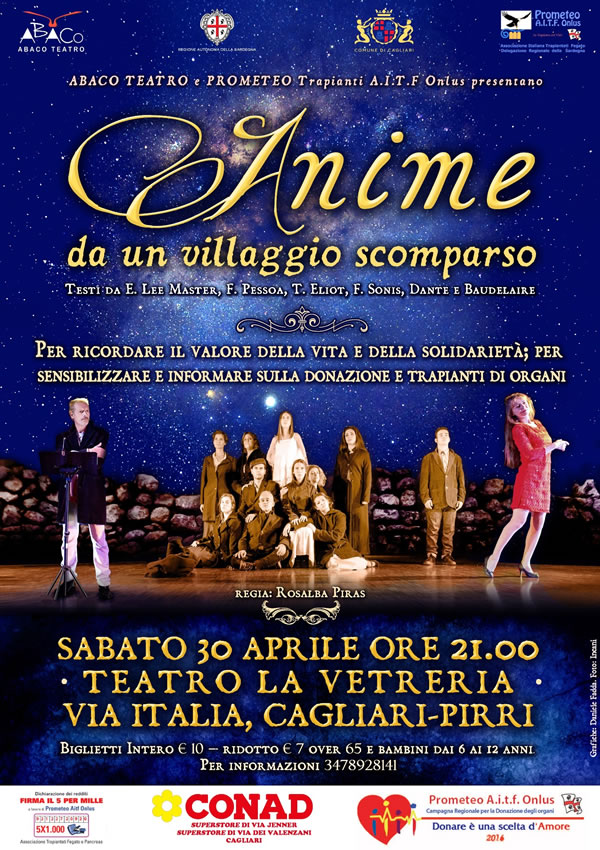 Sabato 30 aprile 2016, alle ore 21, al Teatro La Vetreria di Cagliari - Pirri andrà in scena lo spettacolo “Anime da un villaggio scomparso” di Abaco Teatro. La serata è organizzata dalla compagnia teatrale e dalla Prometeo AITF Onlus per sensibilizzare sulla donazione degli organi attraverso un’opera in piena sintonia con il “sentire” dell’associazione di trapiantati sardi.