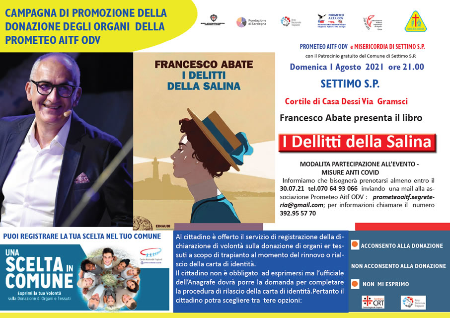 domenica 1° agosto organizzeremo a Settimo San Pietro, in collaborazione con la Confraternita di Misericordia, la presentazione dell’ultimo libro di Francesco Abate “I delitti della salina”.