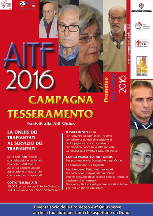 Vi comunichiamo che fin da ora è possibile potersi iscrivere, o rinnovare l'iscrizione, alla Associazione nazionale dei trapiantati di fegato denominata A.I.T.F. con sede in via Bramante 88 a Torino, tramite l'iscrizione alla sua Delegazione Regionale denominata Prometeo Aitf Onlus con sede a Cagliari (Pirri) in Via Monteleone, 44.