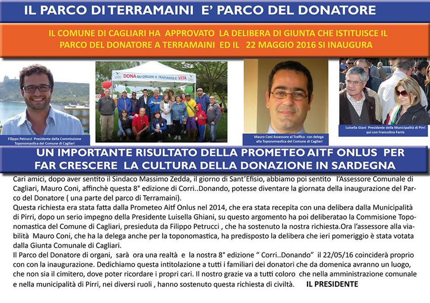 Dopo la nostra richiesta del 2014 di intitolare una parte del Parco di Terramaini alla figura del Donatore di Organi, domenica a seguito di tutta la procedura partita dalla Municipalità di Pirri, dopo un serio impegno della Presidente Luisella Ghiani, su questo argomento ha poi deliberatao la Commisione Toponomastica del Comune di Cagliari, presieduta da Filippo Petrucci , che ha sostenuto la nostra richiesta. Ora l’assessore alla viabilità Mauro Coni, che ha la delega anche per la toponomastica, ha predisposto la delibera che in questi giorni è stata votata dalla Giunta Comunale di Cagliari.