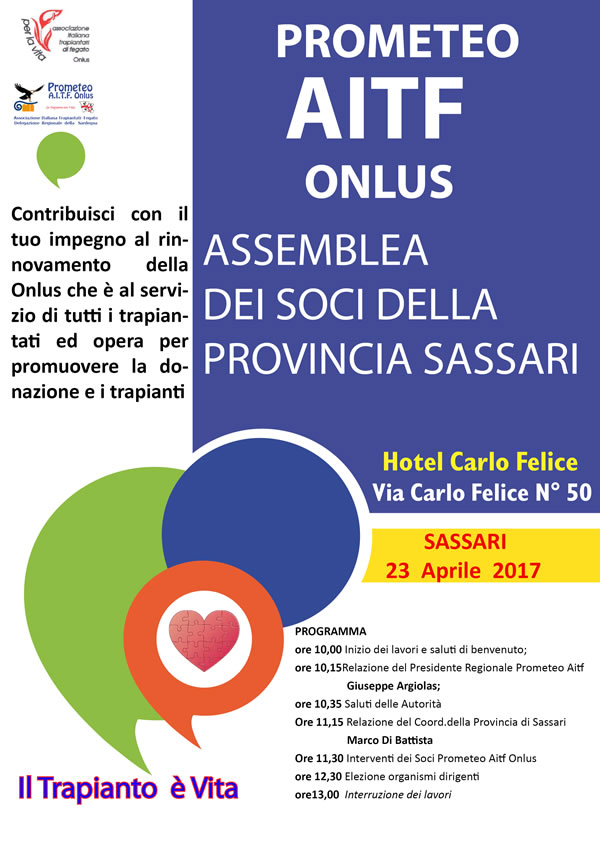Domenica 23 aprile, infine, alle ore 10, la Prometeo AITF Onlus aprirà a Sassari, presso l'Hotel Carlo Felice, un’assemblea dei soci della Provincia, volta in particolare ad eleggere i dirigenti provinciali e a pianificare l’attività che l’associazione intende svolgere nei prossimi mesi in questa zona della Sardegna.