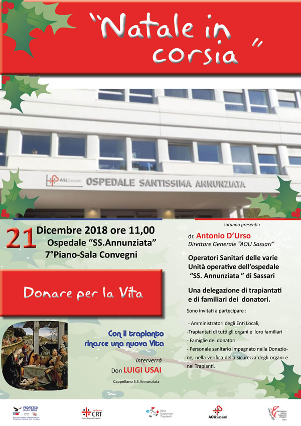 Venerdì prossimo, 21 dicembre 2018, il Coordinamento provinciale di Sassari della Prometeo AITF ODV organizzerà la manifestazione “Natale in corsia” presso la sala riunioni del 7° piano dell’Ospedale “SS. Annunziata” di Sassari.