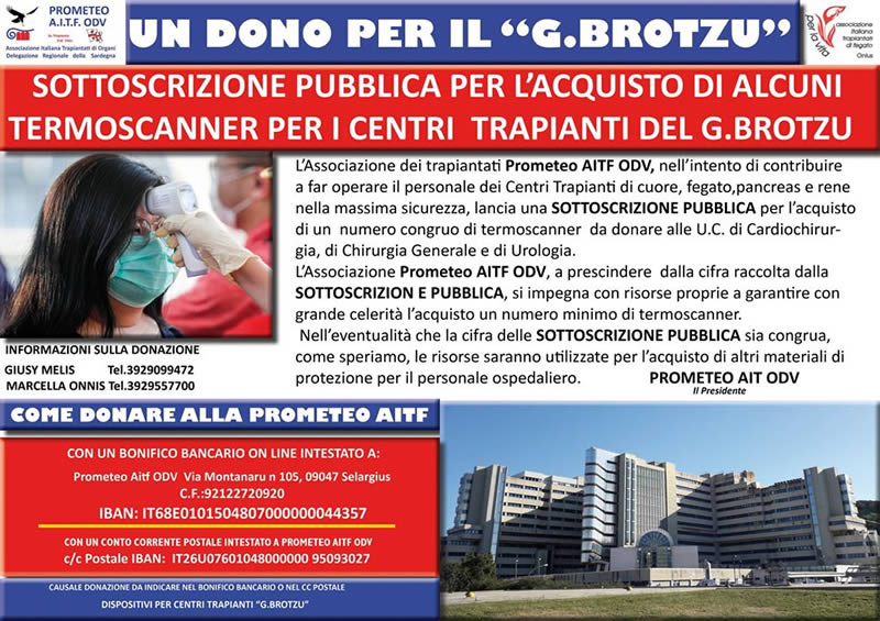 La Prometeo ha avviato una raccolta fondi per donare ai Centri trapianti del “Brotzu” (e altri reparti “collegati”) termoscanner e altri materiali utili ad affrontare l’emergenza causata dal COVID-19.