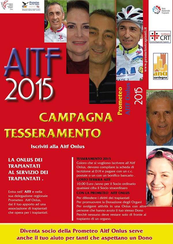 Vi comunichiamo che dal 01/01/2015 è possibile potersi iscrivere alla Associazione nazionale dei trapiantati di fegato denominata A.I.T.F. con sede in via Bramante 88 a Torino, tramite l'iscrizione alla sua Delegazione Regionale denominata Prometeo Aitf Onlus con sede a Cagliari in Via S.Maria Goretti N°2.