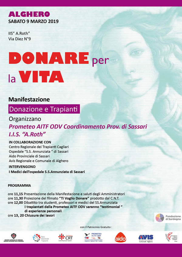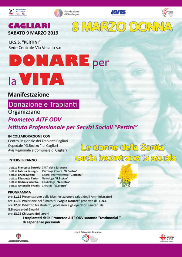 Sabato 9 marzo 2019 l’associazione di trapiantati Prometeo AITF ODV ha in programma un incontro con le studentesse dell'indirizzo sanitario dell’Istituto professionale “S. Pertini” di Cagliari. Ad affiancare le volontarie dell’associazione ci saranno alcune operatrici sanitarie del Centro regionale trapianti (CRT) e dell’ospedale “G. Brotzu” di Cagliari. Solo donne per un motivo preciso: perché le donne che lavorano sono un simbolo di emancipazione, tema su cui la riflessione deve essere continua se non si vuole svuotare di significato la ricorrenza dell’8 marzo.