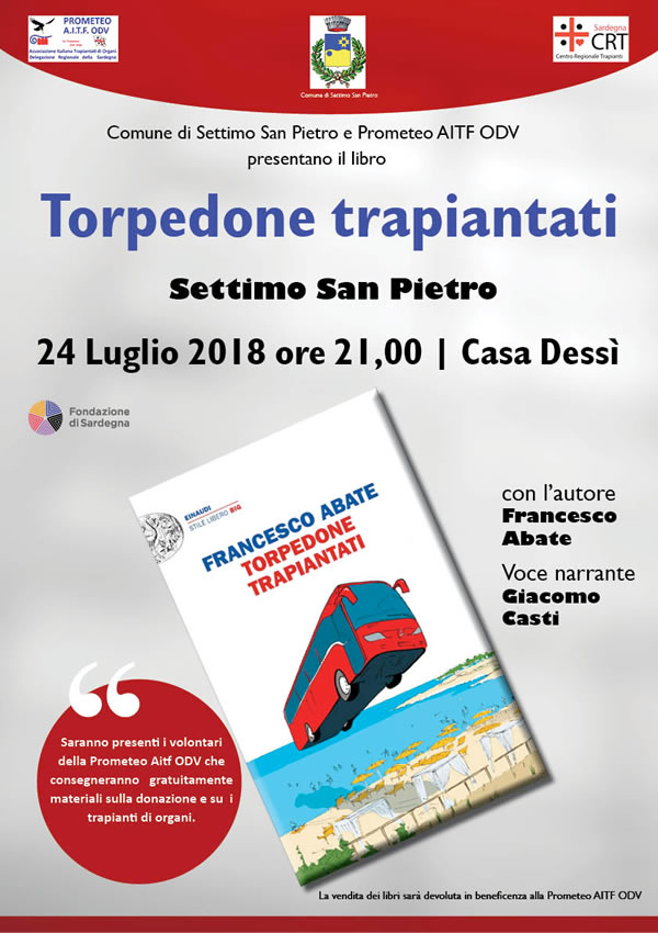 Martedì 24 luglio 2018, alle ore 21.00, lo scrittore Francesco Abate presenterà a Settimo San Pietro, presso Casa Dessì, il suo ultimo libro “Torpedone trapiantati”. La serata, organizzata dall’associazione di trapiantati Prometeo AITF ODV in collaborazione con l’Amministrazione comunale, sarà arricchita da letture a cura dell’attore Giacomo Casti.