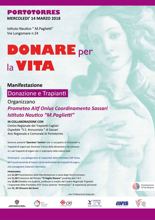 Mercoledì 14 marzo 2018 riprenderanno gli incontri di sensibilizzazione organizzati nelle scuole dalla Prometeo AITF Onlus. Questa volta sarà l’Istituto TTL "M. Paglietti" di Porto Torres a ospitare l’associazione di trapiantati e gli operatori sanitari che, in tali occasioni, sempre ne accompagnano i volontari.