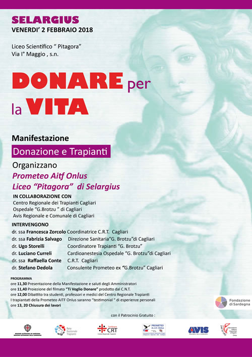 Dopo l’assemblea pubblica di venerdì scorso, la Prometeo AITF Onlus tornerà a Selargius per incontrare, il 2 febbraio 2018, studenti e docenti del Liceo scientifico “Pitagora”. L’incontro avrà inizio intorno alle ore 11.30 e sarà, come di consueto, volto a sensibilizzare, in particolare, i giovani sulla donazione di organi e a informarli sui trapianti e sulle malattie che possono renderli necessari.
