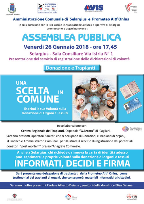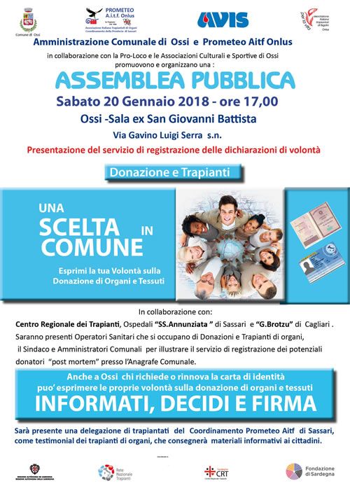 Sabato 20 gennaio 2018 la Prometeo AITF Onlus, in collaborazione con l’Avis e l’Amministrazione comunale di Ossi, organizzerà un’assemblea pubblica per informare sui trapianti e sensibilizzare sulla donazione di organi e sangue.