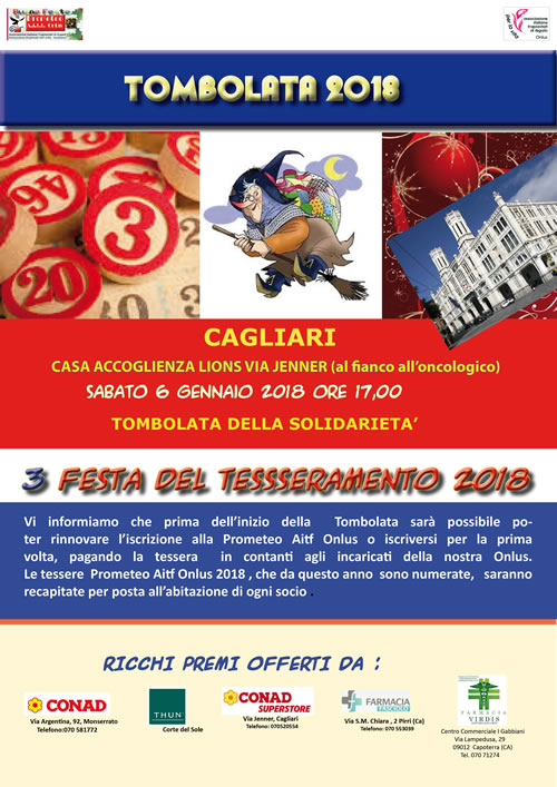 Sabato 6 gennaio 2018 la Prometeo Aitf Onlus festeggerà la Befana presso la Casa di accoglienza Lions, in via Jenner a Cagliari, con una tombolata benefica che avrà inizio alle ore 17.30.