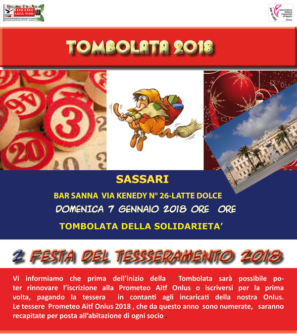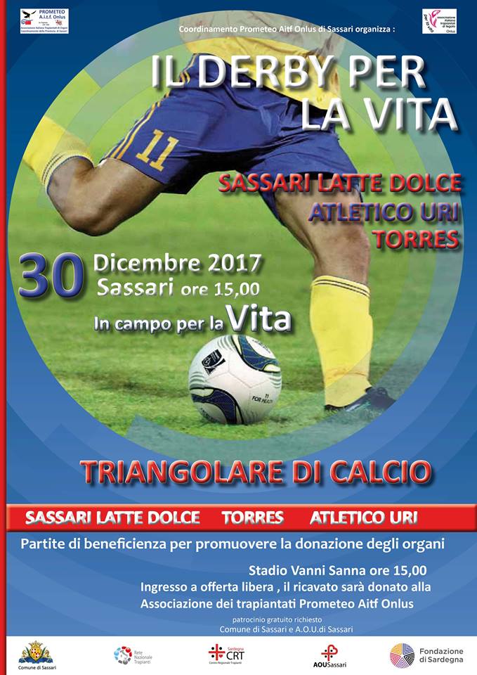 Si chiuderà sabato 30 dicembre, con un “Derby per la vita”, l’attività dell’associazione di trapiantati Prometeo AITF Onlus per l’anno solare 2017: alle ore 15.00, allo stadio comunale “Vanni Sanna” di Sassari, scenderanno in campo le squadre Sassari Latte Dolce, Torres di Sassari e Atletico Uri per disputare un triangolare di calcio a scopo benefico.