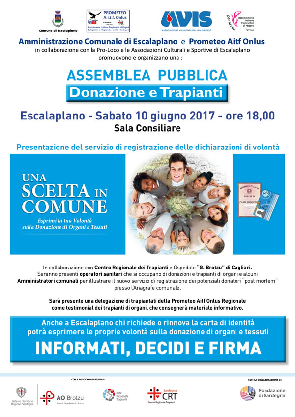 Sabato 10 giugno 2017 è in programma un’assemblea pubblica organizzata da Prometeo AITF Onlus e Amministrazione comunale per informare gli abitanti di Escalaplano sui trapianti e sulle donazioni di organi.