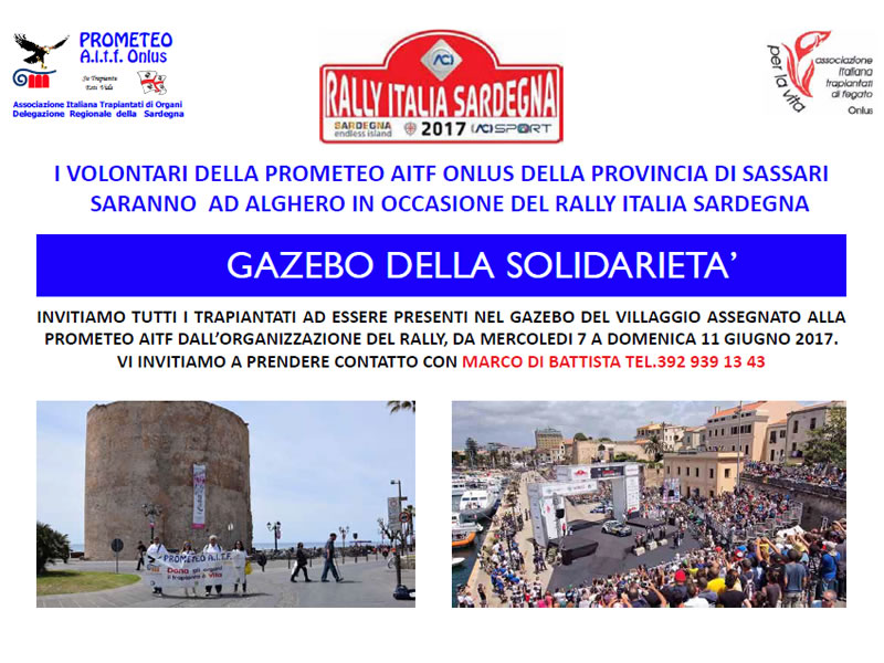 Mentre da mercoledì (e fino a domenica) un gruppo di volontari è impegnato ad Alghero nel promuovere la donazione di organi e informare sui trapianti in occasione del Rally Italia Sardegna, un altro gruppo della Prometeo AITF Onlus sarà presente a Escalaplano sabato prossimo, 10 giugno 2017. Qui, infatti, presso la sala consiliare, dalle ore 18.00 si svolgerà un’assemblea pubblica organizzata dall’associazione di trapiantati in collaborazione con Amministrazione comunale, Avis, Pro Loco e associazioni locali. L’incontro è stato fortemente voluto da un nutrito gruppo di abitanti di Escalaplano che, dopo aver visto rinascere un compaesano grazie a un trapianto, si è avvicinato a questi temi e, in particolare, alla Prometeo.