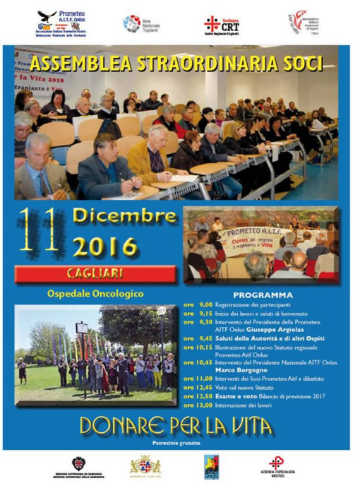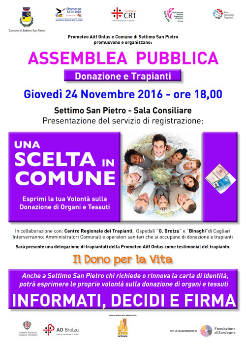 A tale scopo, questa sera Giovedi 24 novembre 2016 l’associazione sarda di trapiantati sarà a Settimo San Pietro, Comune che ha aderito al progetto e che dalla scorsa settimana è già in grado di raccogliere le dichiarazioni di volontà di chi si reca all’Anagrafe per rinnovare o richiedere per la prima volta la carta di identità.