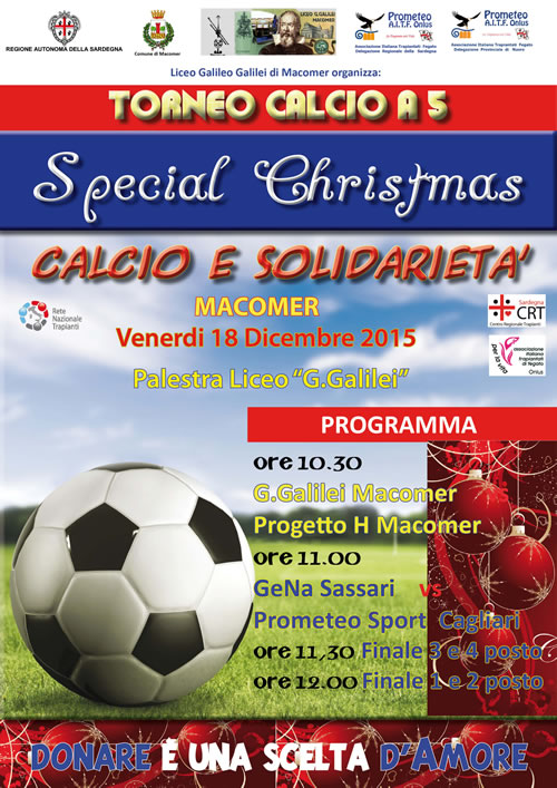 Venerdì 18 dicembre 2015 a Macomer per il Torneo solidale di calcio a 5 "Special Christmas" e sabato 19 a Nuoro per incontrare i soci presenti sul territorio: così proseguirà nel fine settimana l’attività della Prometeo AITF Onlus volta a promuovere la donazione degli organi e a informare sui trapianti.