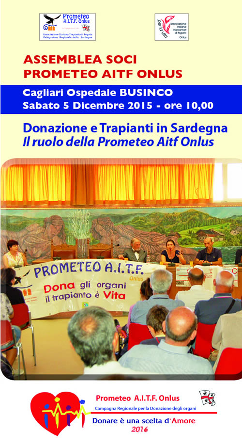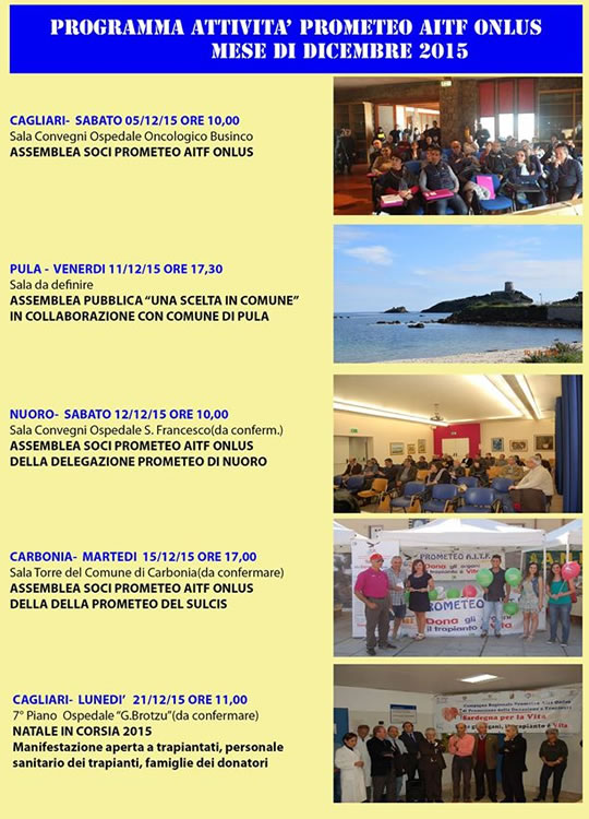 L’attività di promozione della donazione degli organi e di informazione sui trapianti svolta dalla Prometeo AITF Onlus proseguirà questa settimana con due importanti appuntamenti: la partecipazione al Torneo solidale di calcio a 5 "Special Christmas", previsto per venerdì 18 dicembre 2015 a Macomer, e un’assemblea locale dei soci, convocata per sabato 19 dicembre a Nuoro.