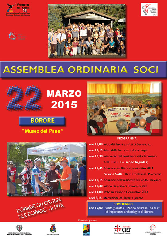 La Prometeo AITF Onlus, Associazione che rappresenta la quasi totalità dei trapiantati di fegato e pancreas della Sardegna, è lieta di comunicarvi che il Consiglio Direttivo della Prometeo AITF Onlus, con determinazione unanime, ha deciso di convocare l’Assemblea Ordinaria dei Soci per il giorno domenica 22 Marzo 2015 presso la Sala Convegni del Museo del Pane in Viale Beccarini snc a Borore (NU).